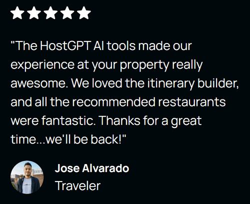 "The HostGPT AI tools made our experience at your property really awesome. We loved the itinerary builder, and all the recommended restaurants were fantastic. Thanks for a great time...we'll be back!"